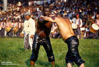 the wrestlers pour olive oil over their entire bodies, and the matches take place in an open, grassy field,